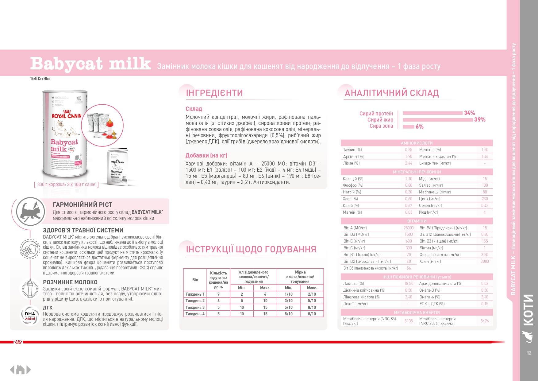 Для стабильного, гармоничного роста котёнка состав Babycat milk максимально приближен к составу молока лактирующей кошки, с высоким содержанием белка и энергии; высокое содержание ДКГ способствует правильному развитию мозга котёнка, нервной системы, сетчатки глаз, когнитивности.